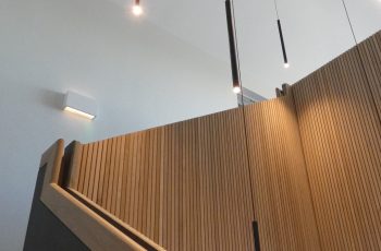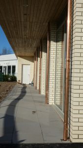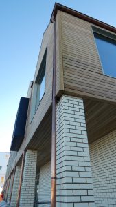 The ground floor of the building constructed with traditional brickwork with a contemporary twist. White bricks and black mortar provide a striking contrast to the timber clad upper floor and copper rainwater downpipes. A roof is a traditionally crafted standing seam roof, steeply pitched and finished in copper offering a high-quality and striking finish.